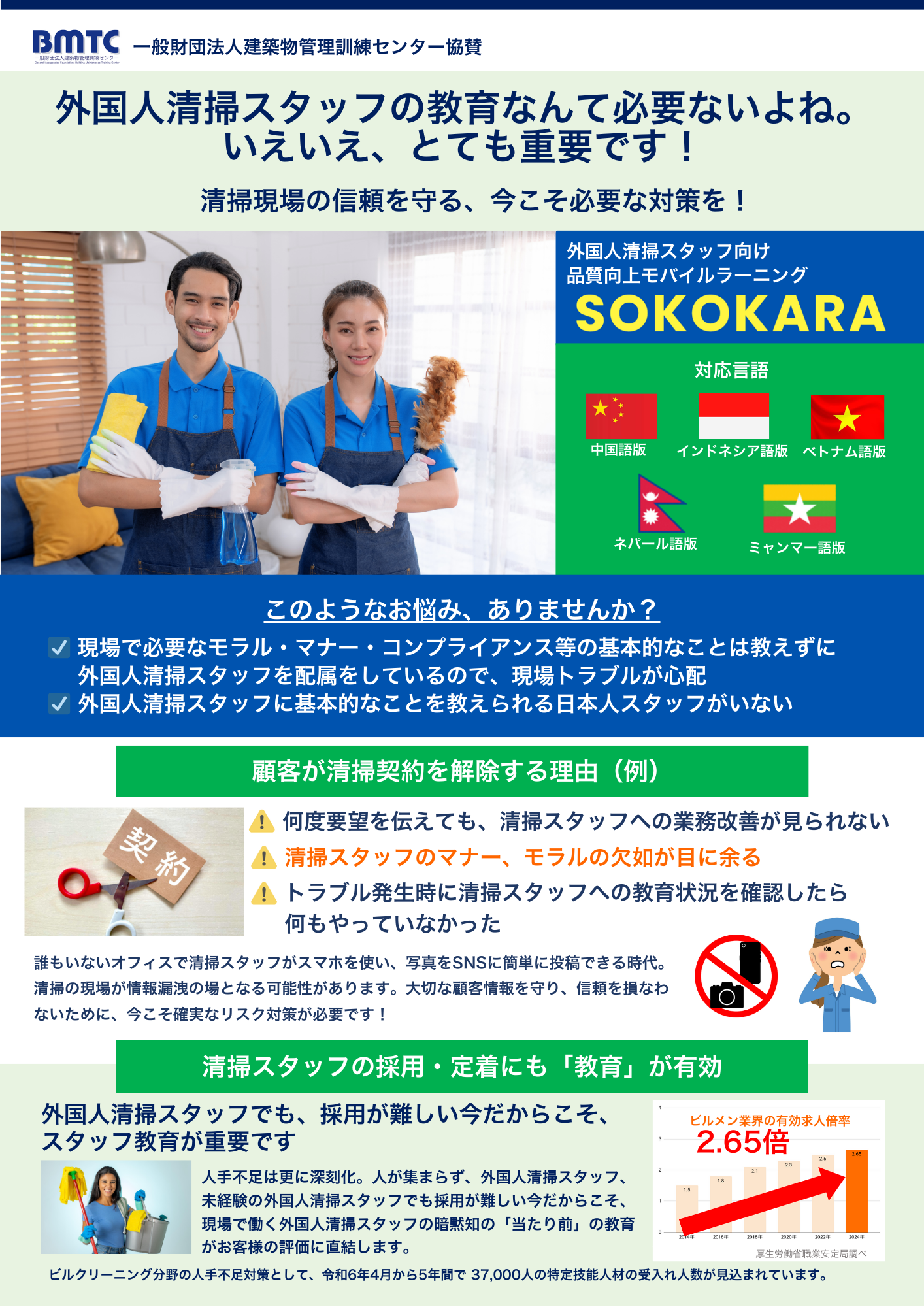 - 現場で必要なモラル・マナー・コンプライアンス等の基本的なことは教えずに、外国人清掃スタッフを配属をしているので、現場トラブルが心配